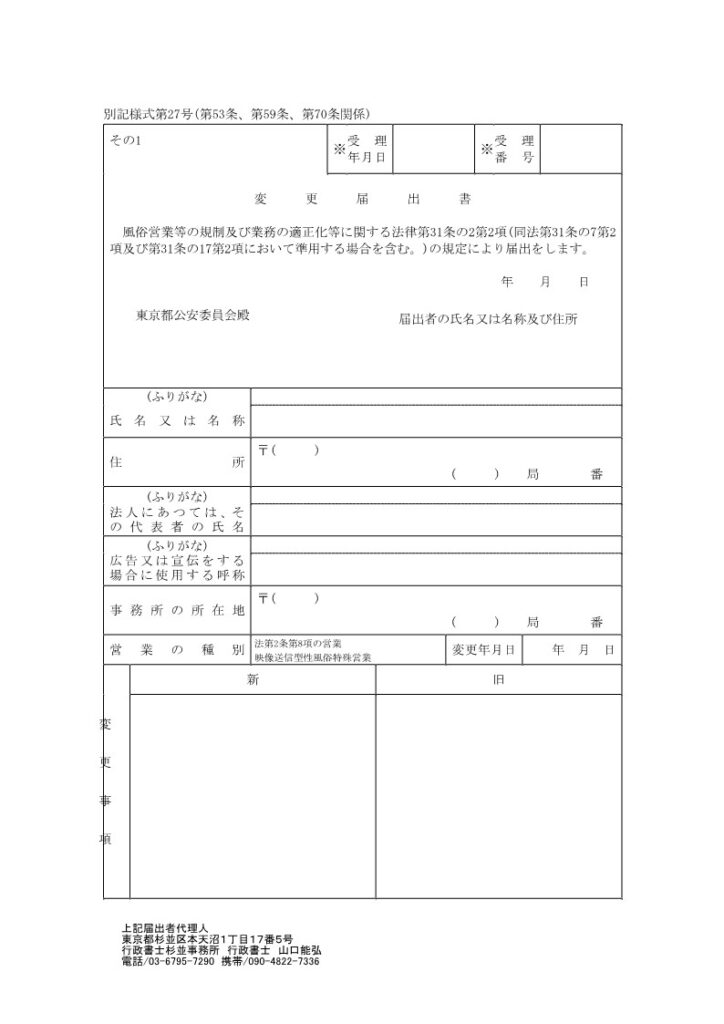 また映像送信型性風俗特殊営業は名義変更手続きは認められていませんので事業承継・譲渡や法人化などにより営業主体が変更する場合にも旧営業の廃止届出をしたうえで新営業の開始届出をする必要があります。