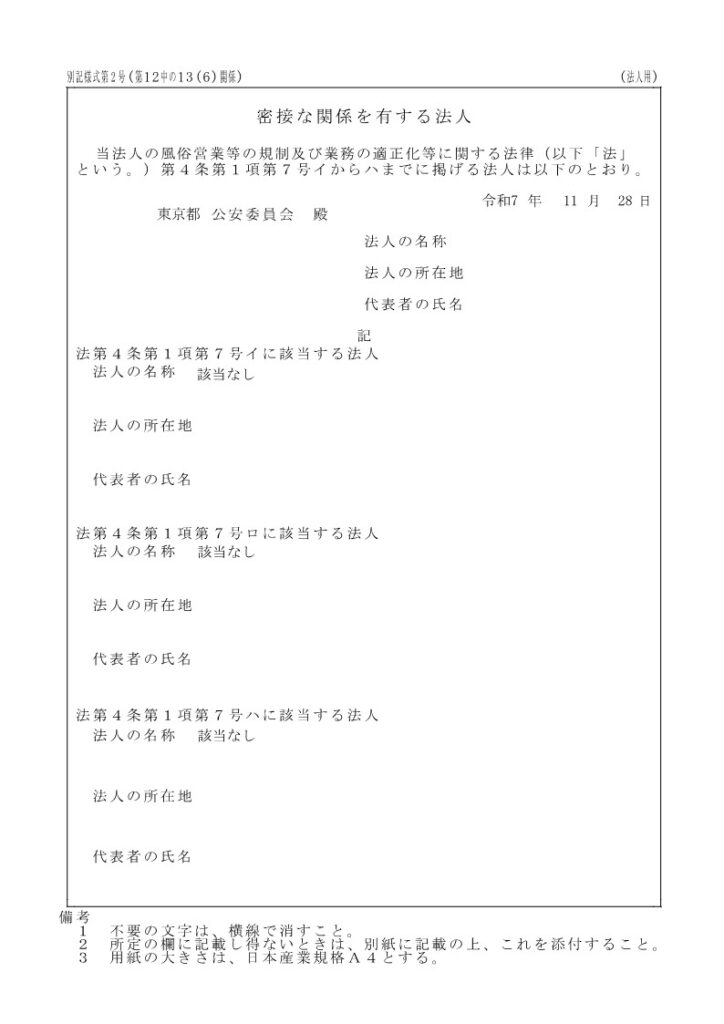 また、東京都公安委員会ではこれらに該当する法人が無い時でも「該当なし」と記載し書類自体は提出する必用があります。